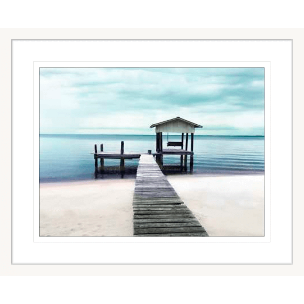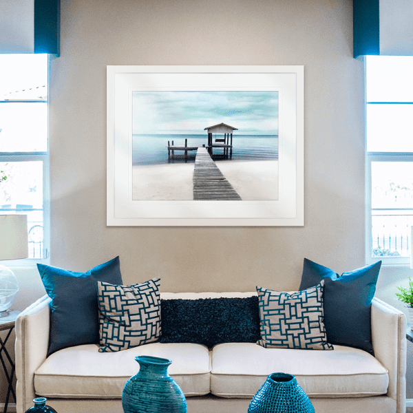 Black and white wall art features a long pier cascading into the deep ocean, with an array of white clouds overhead, wall mounted in a white frame